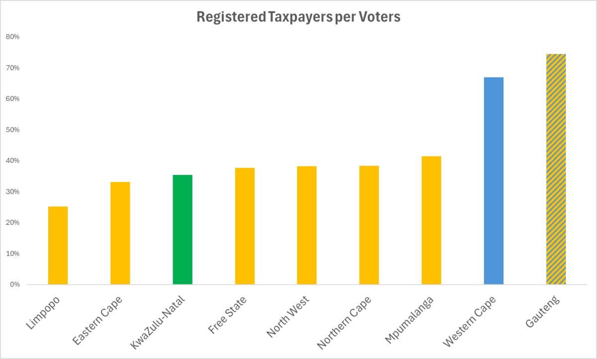Gauteng and the Western Cape, where the DA performed well, are the only provinces in South Africa where over 50% of voters were registered taxpayers.
