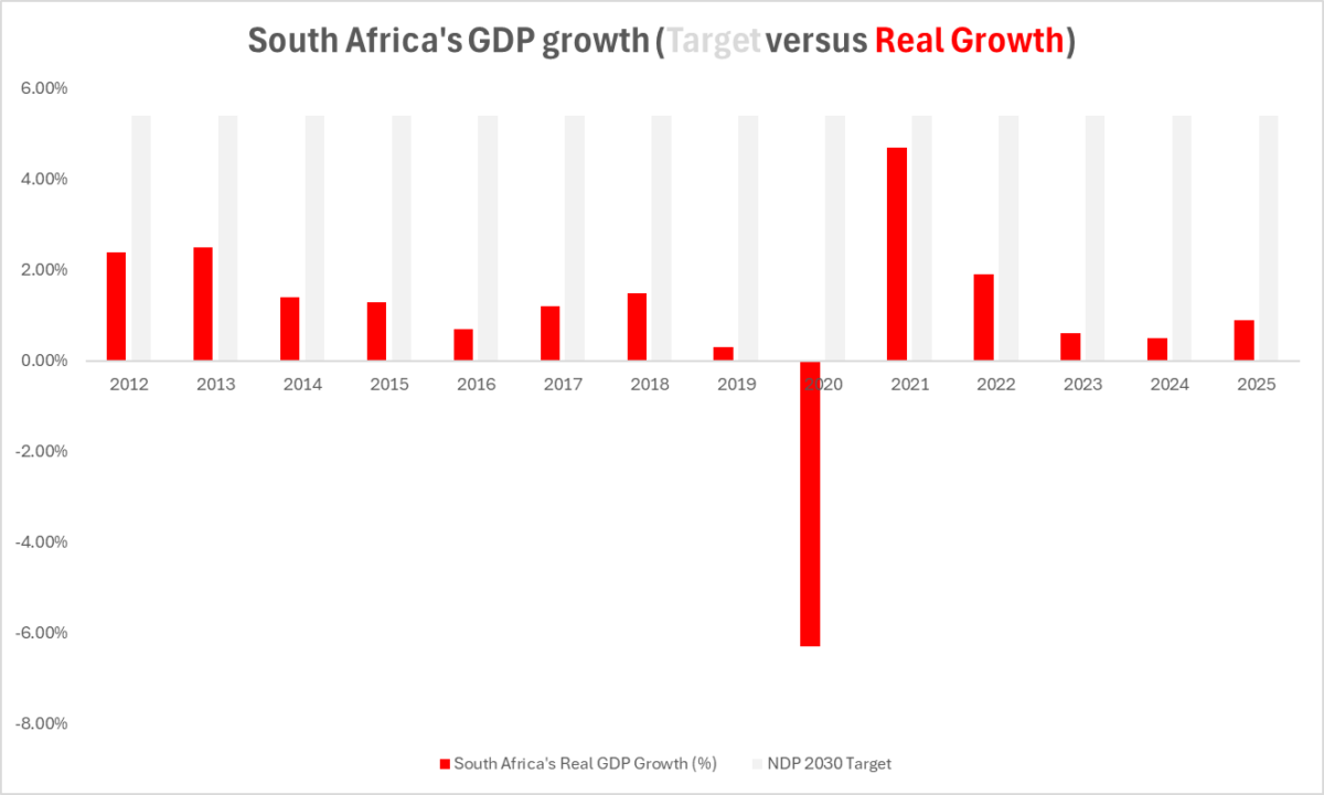 The South African Government’s National Development Plan (NDP) 2030 set a goal of 5.4% GDP growth. Instead of increasing economic growth, it plummeted to under 1%.