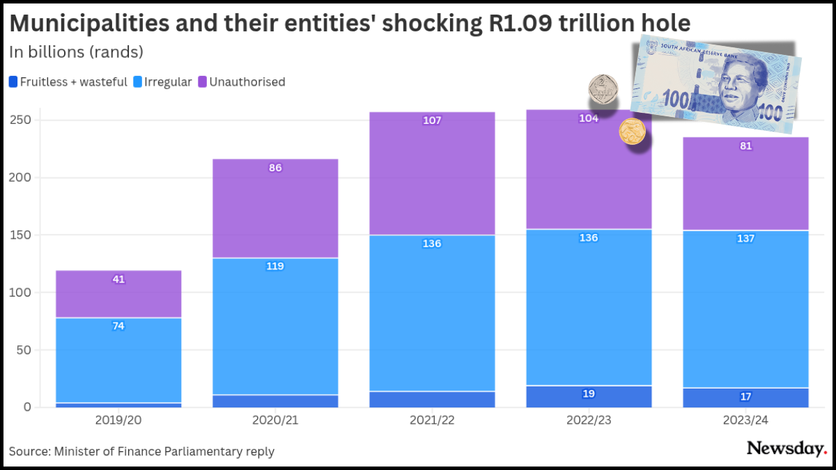 Municipalities and municipal entities have reported more than R1.08 trillion in fruitless, wasteful, irregular, and unauthorised expenditure between the 2019/20 and 2023/24 financial years.