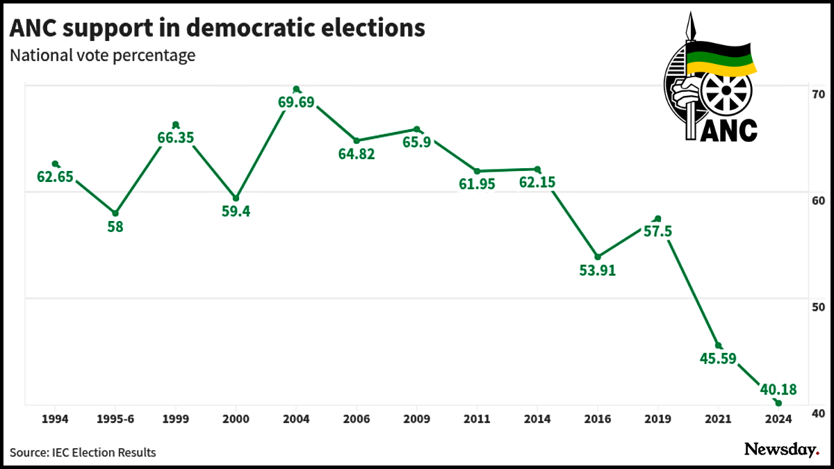 The party has gone from a high of 69.69% of the national vote in 2004, to 40.18% in the 2024 general elections.