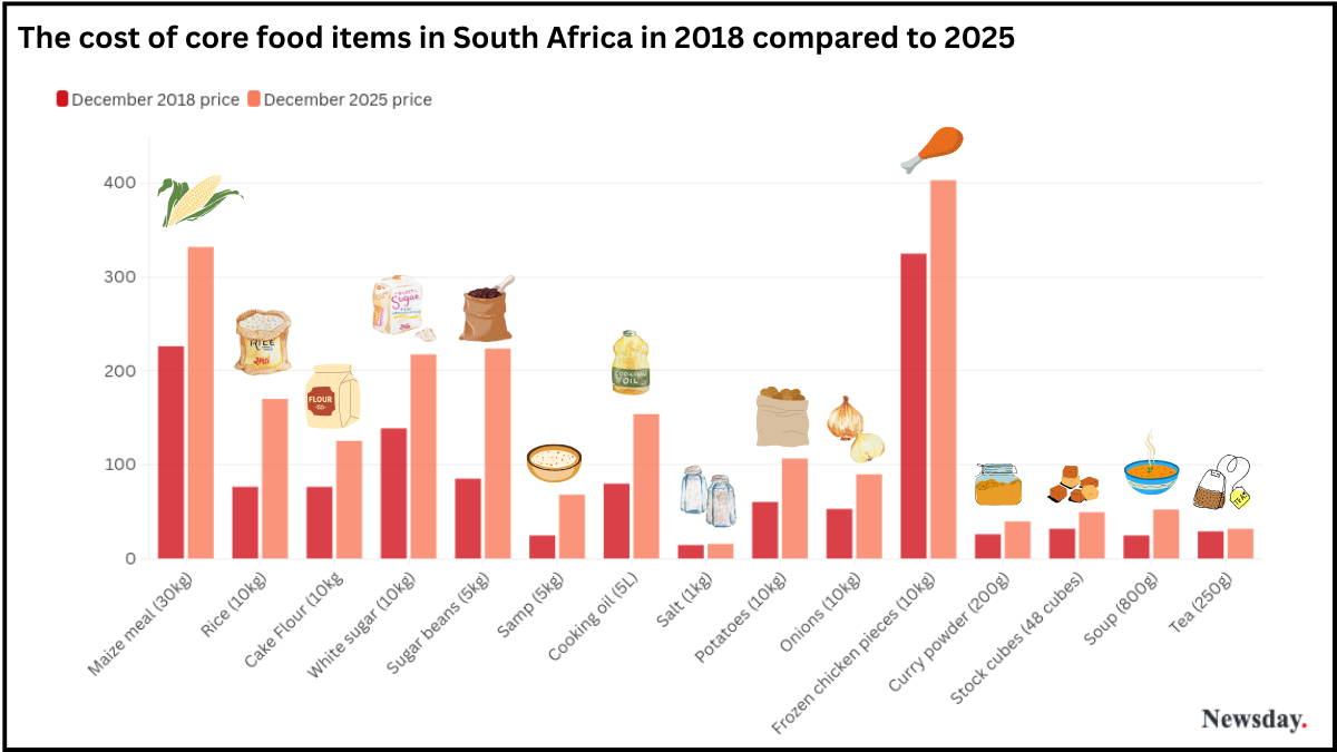 The 2025 December basic food basket cost of R5,333.45, while a decrease from the 2024 figure of R5,383.38, remains stubbornly high since a spike between 2020 and 2022 driven by global factors.