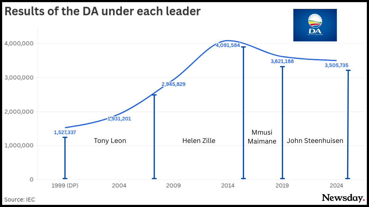 The DA had four leaders over the last 30 years – Tony Leon, Helen Zille, Mmusi Maimane, and John Steenhuisen.