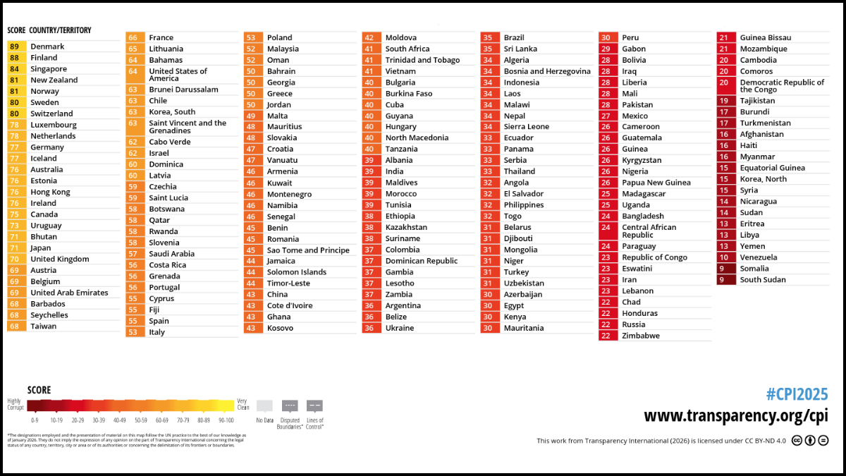 The index uses a scale of 0 (highly corrupt) to 100 (very clean). For 2025, the global average dropped for the first time in over a decade, settling at just 42 out of 100.