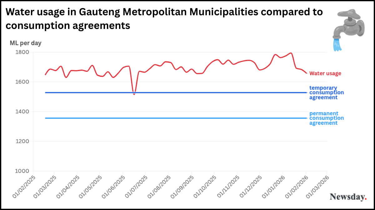 Data from Rand Water shows that demand for water in Gauteng metros is consistently above consumption agreements.